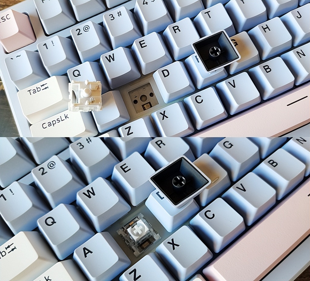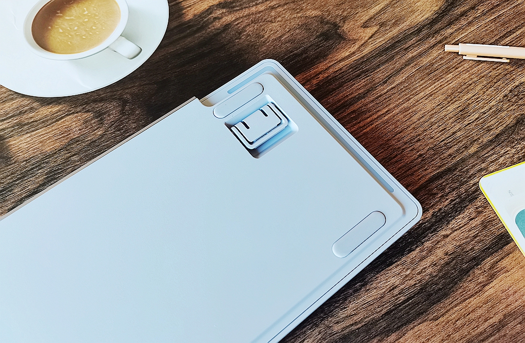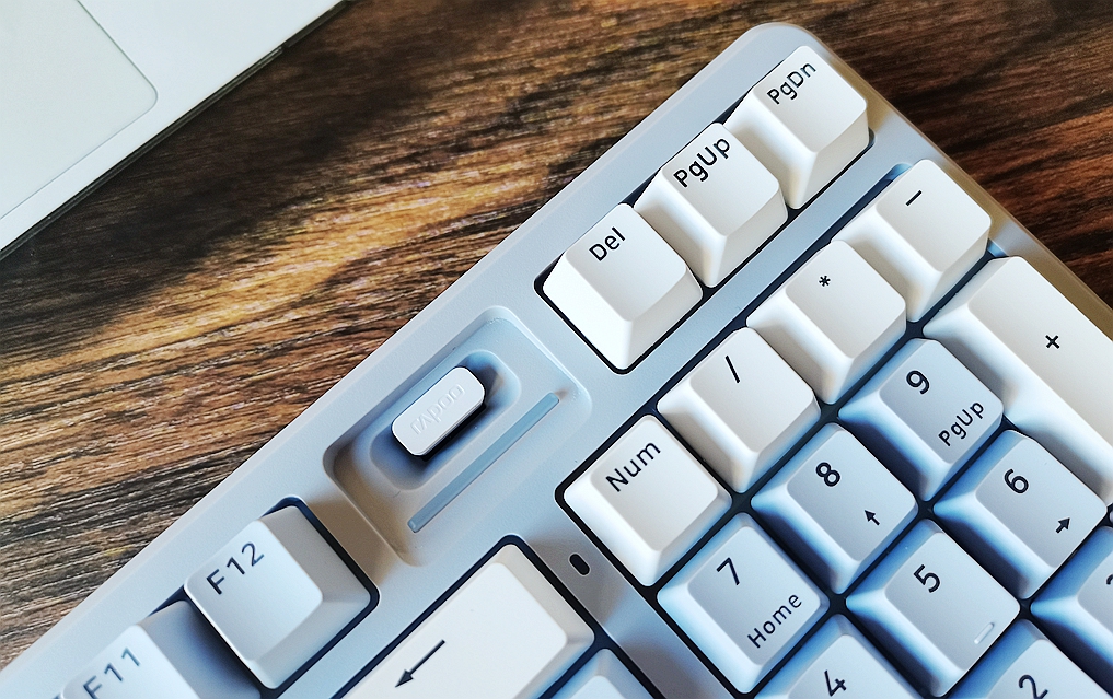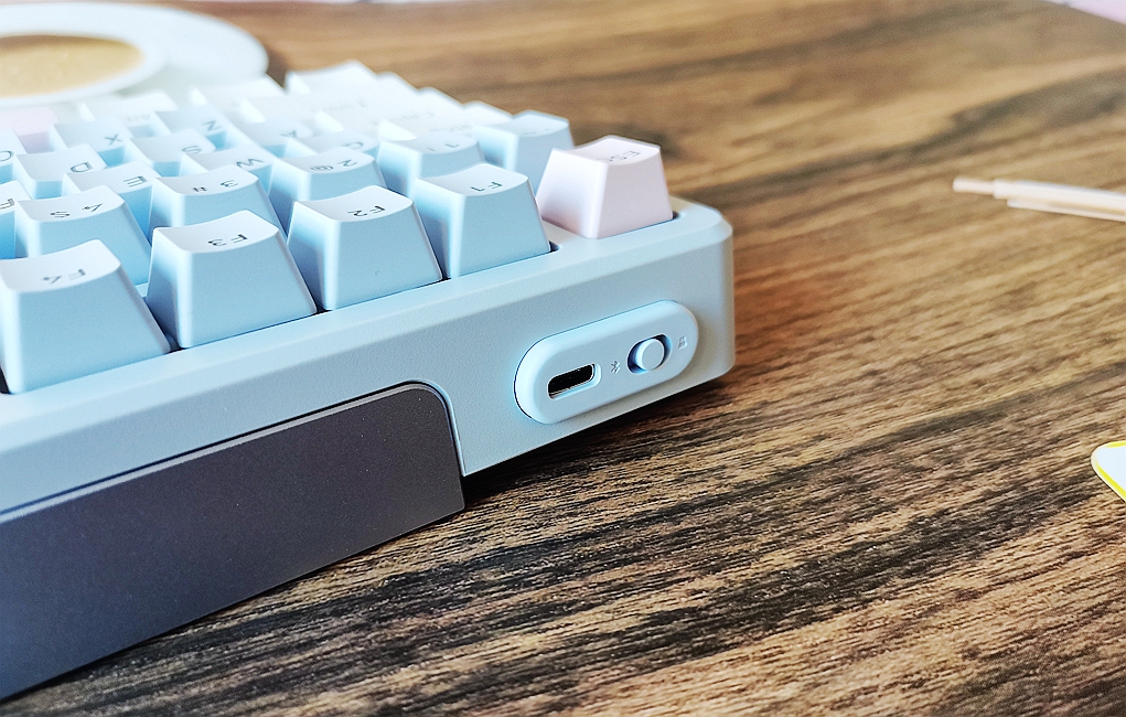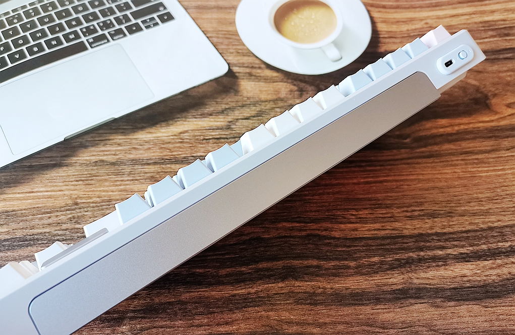 键盘的Type-C接口和模式切换开关被放置在上方左侧,略微凸起。中间则是左右对称的长金属铝合金装饰条。设计位置和大小比较隐蔽,没有占用多余的空间,这样的设计还是非常人性化。