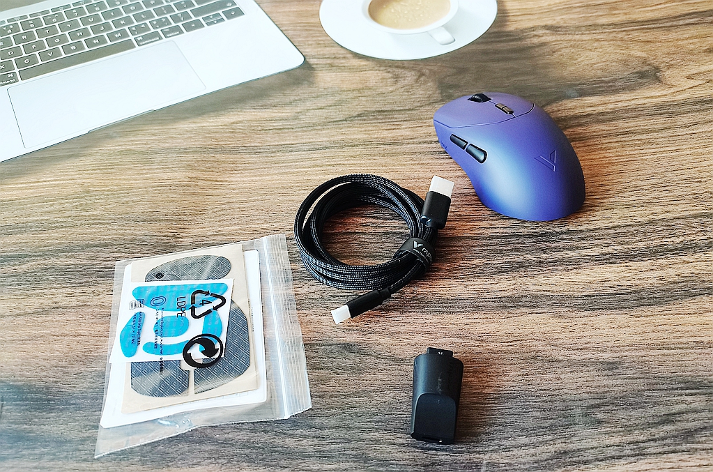 雷柏VT9 MAX鼠标:鼠标、脚贴、按键防滑贴、一根8K带屏蔽高速数据线、2.4G接收器和USB转接器。
