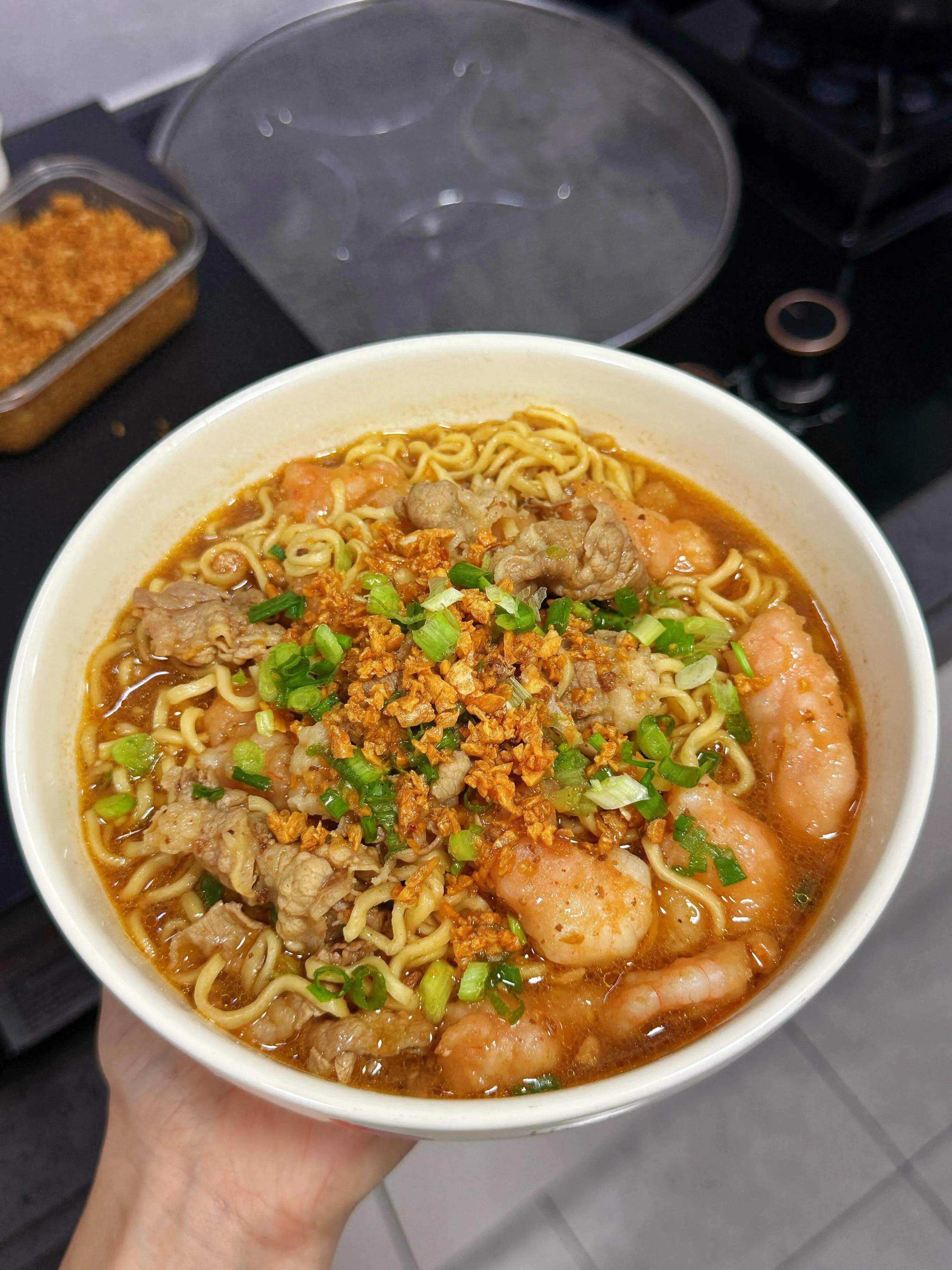 看,一碗汤色金黄醇厚、香气霸道、用料十足的肥牛沙茶面就完成了!先喝一口汤,沙茶的复合咸香和花生酱的顺滑完美结合,瞬间打开所有味蕾。再夹起一筷子裹满汤汁的面条,配上嫩滑的肥牛和爽脆的青菜,各种口感在嘴里交响。这碗面,吃的是一种快捷而不将就的生活态度。