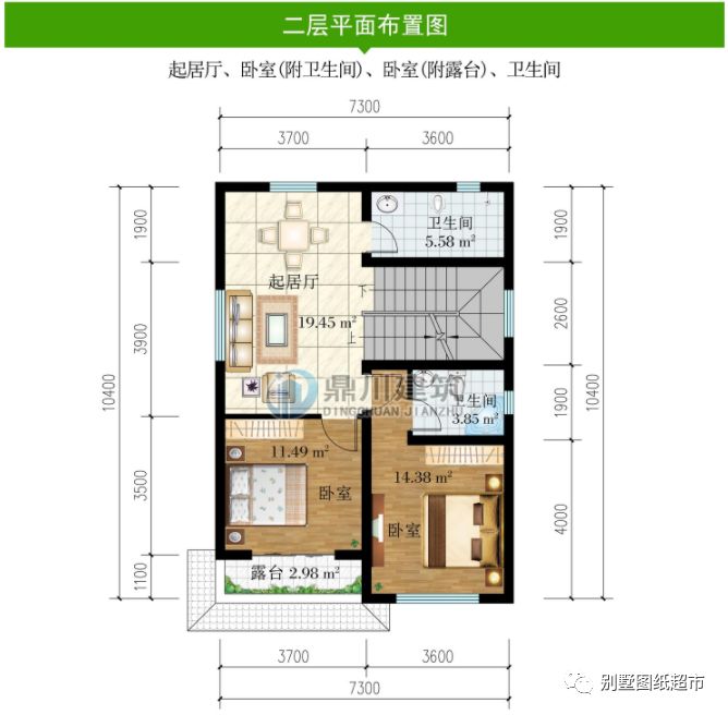 二 层:起居厅、卧室(附卫生间)、卧室(附露台)、卫生间