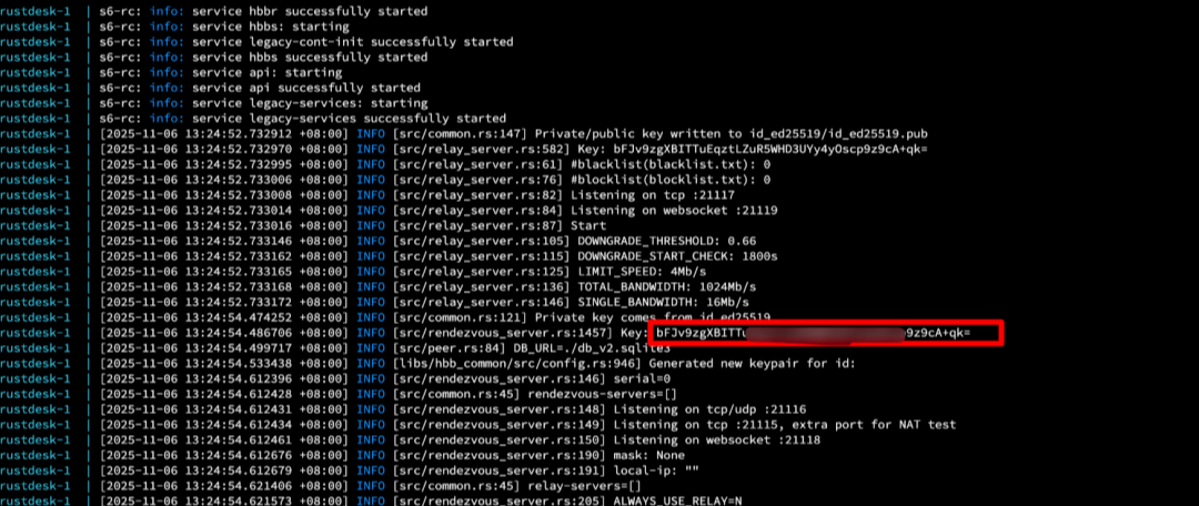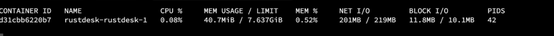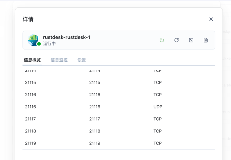 docker-compose psNAME IMAGE COMMAND SERVICE CREATED STATUS PORTSrustdesk-rustdesk-1 lejianwen/rustdesk-server-s6:latest "/init" rustdesk 53 minutes ago Up 53 minutes (healthy) 0.0.0.0:21114-21119->21114-21119/tcp, [::]:21114-21119->21114-21119/tcp, 0.0.0.0:21116->21116/udp, [::]:21116->21116/udp