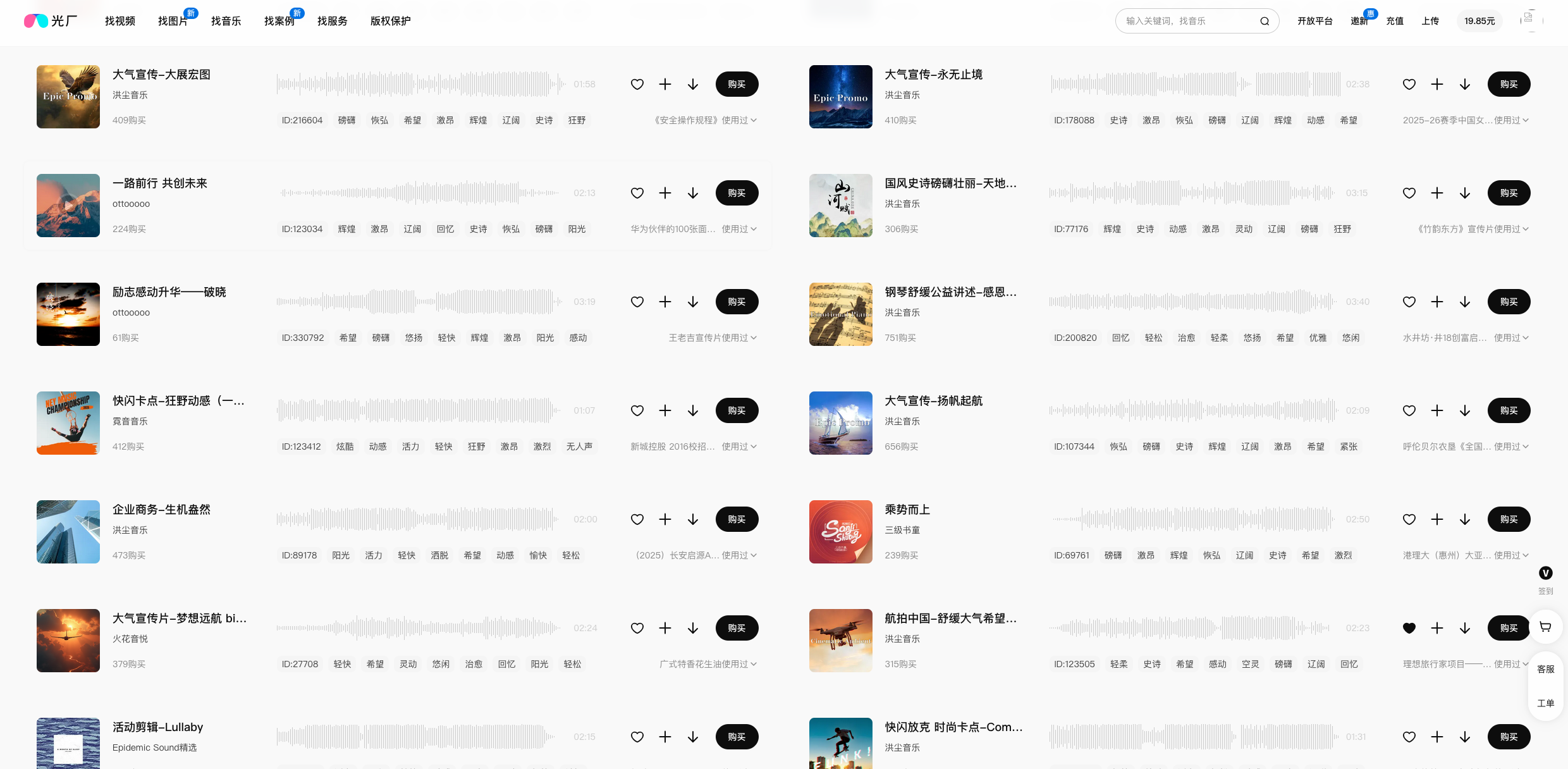 作为国内老牌的商用版权素材平台,光厂自2015年上线以来已积累超过120万条正版音乐素材,其中轻音乐资源尤为丰富。平台针对中文用户习惯做了专门优化,不仅有常规的纯音乐分类,更独家上线了 “中华传统乐器音源库” ,收录古琴、琵琶、二胡等高保真采样。