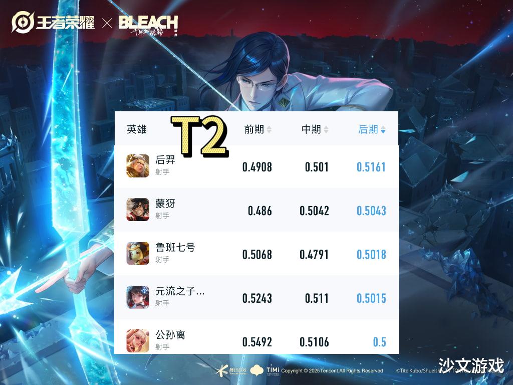 首先排在射手后期强势榜T2的英雄有后羿、蒙犽、鲁班七号、元流之子(射手)、公孙离,这些英雄的后期强势指数在0.50至0.52之间。