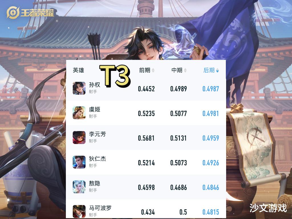 首先排在射手后期强势榜T3的英雄有孙权、虞姬、李元芳、狄仁杰、敖隐、马可波罗,这些英雄的后期强势指数在0.48至0.50之间。