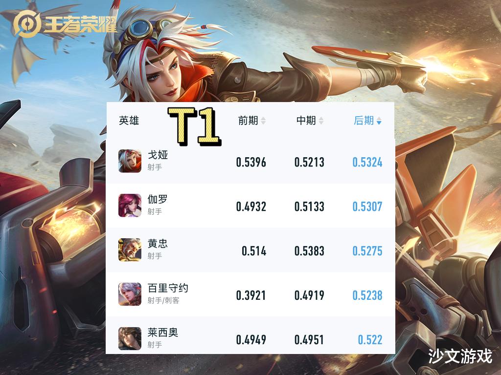 排在射手后期强势榜T1的英雄有戈娅、伽罗、黄忠、百里守约、莱西奥,这些英雄的后期强势指数在0.52至0.54之间。