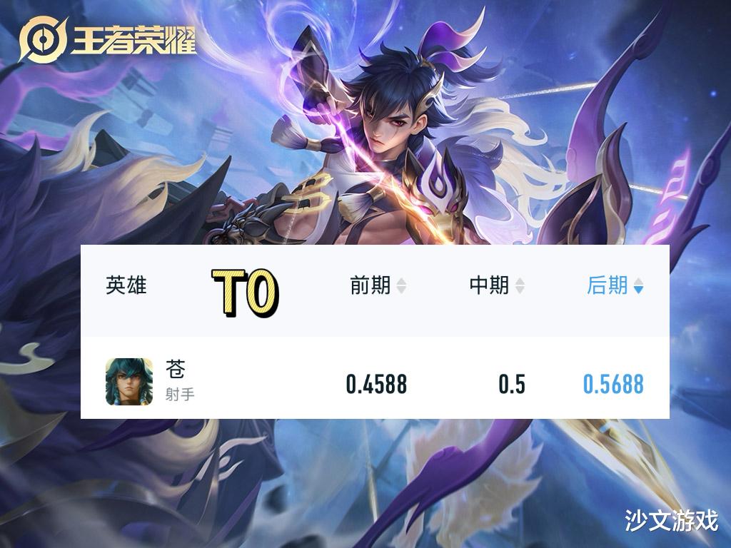首先排在射手后期强势榜T0的英雄有苍,苍在当前版本是后期最强势的英雄,后期强势指数为0.5688。