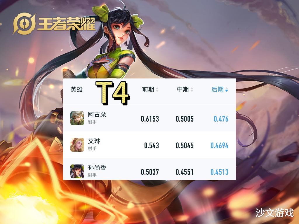 首先排在射手后期强势榜T4的英雄有阿古朵、艾琳、孙尚香,这些英雄的后期强势指数在0.45至0.47之间。