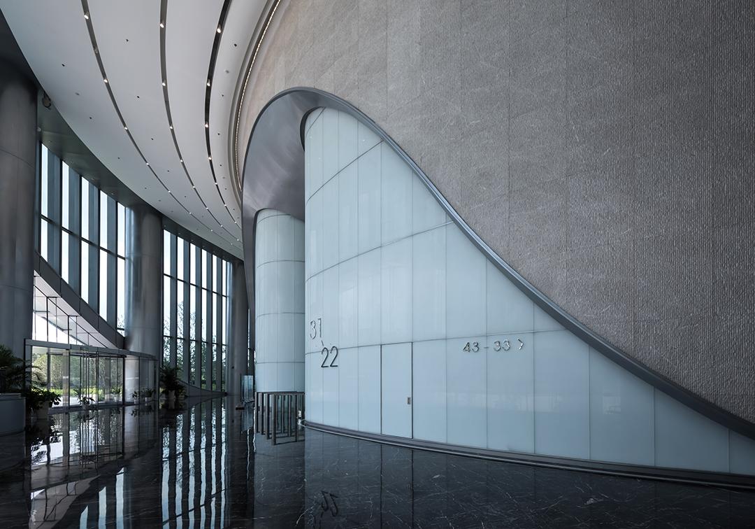 幕墙设计同样丰富多样,共采用八种主要立面类型,呼应办公、酒店等不同功能区的需求。外侧冷弯板块如湖面流动,内侧彩釉垂幕板块则通过渐变透明度,在天空映衬下勾勒出波光粼粼的立体效果。