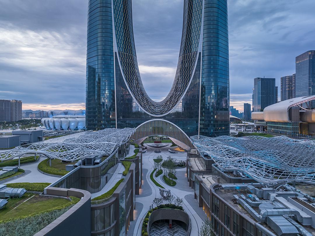 两栋塔楼均为64层,结构高度282米,由一座跨度约60米、高约22米的钢结构天桥相连。天桥上方悬挂着一面由玻璃与钢材构成的“垂幕”,成为一处向公众开放的舒适空间。