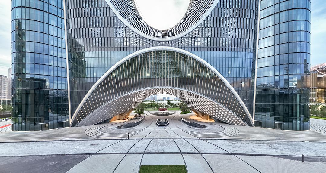 双塔之间的曲线连廊,其底部比例参照杭州传统拱桥,水面倒影围合成圆,仿佛江南园林中的月洞门,传递出圆满和谐的美学意境。