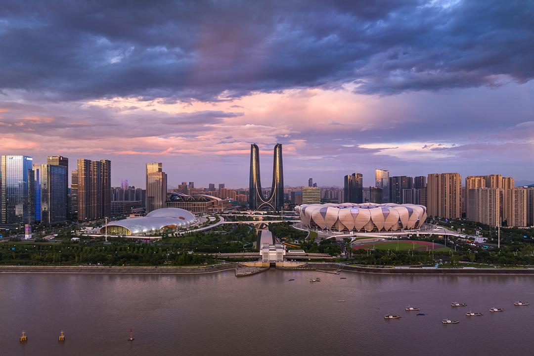 杭州世纪中心(又名“杭州之门”)坐落于钱江世纪城的核心区域,东临国际博览中心,西接综合训练馆,与奥体中心“大莲花”为邻。双塔面向钱塘江与利民河展开,从江南大道远望,这座建筑如同进入市区的重要门户,在城市天际线中占据独特位置。