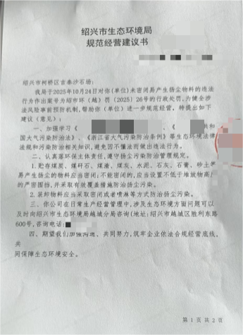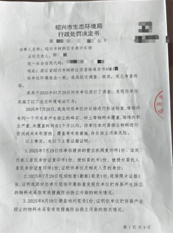 创业之路并非一帆风顺。2025年7月29日,绍兴市生态环境局在对绍兴市柯桥区吉泰沙石场进行执法检查时发现,其堆场内“有约一千平米易产生扬尘的碎石、砂土等物料未覆盖”,且“场地内积尘严重”。依据《大气污染防治法》第七十二条第一款等规定,该行为被认定为生态环境违规行为。