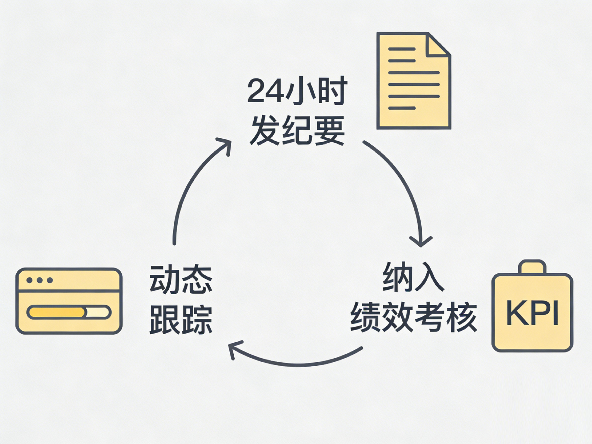 我一直强调:如果会议决议和绩效考核不挂钩,那就等于没有约束力。把重点决议事项纳入当月的KPI,完成情况直接影响绩效评分。这样一来,没有人敢把会上定的任务当耳边风。