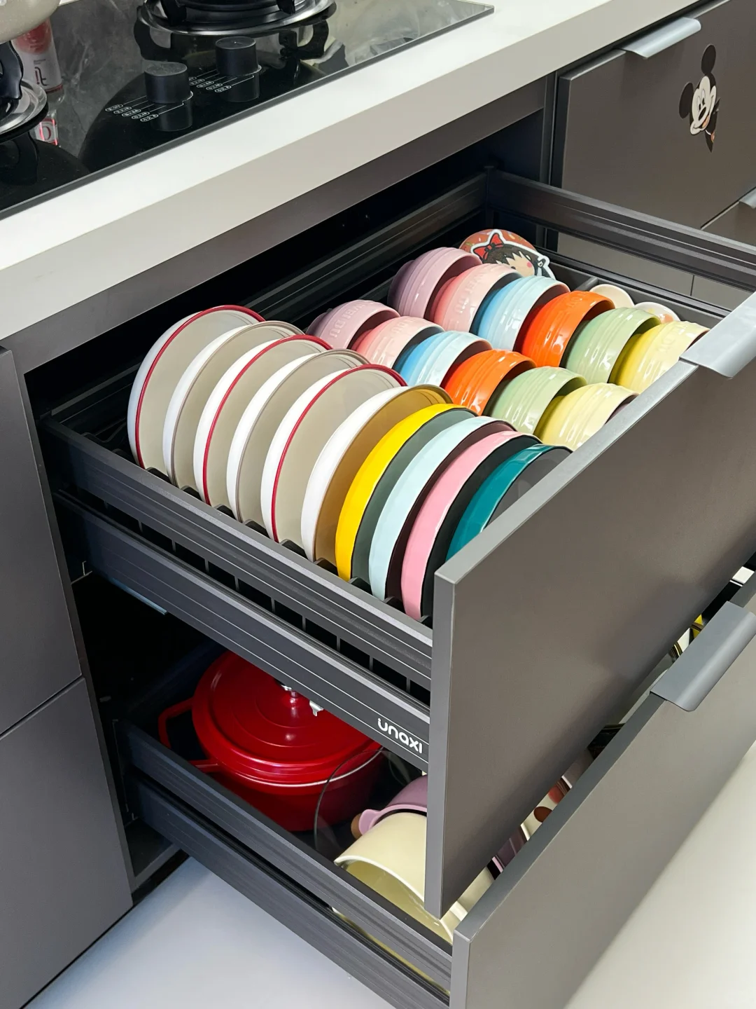 网友@蚂蚁 的分享:我家做橱柜的时候,做了双层碗盘拉篮,我的家里盘子挺多的,正常橱柜存储的时候,那碗盘还要蹲下拿,很不方便,做了碗盘拉篮现在拿取方便,而且也好沥水。
