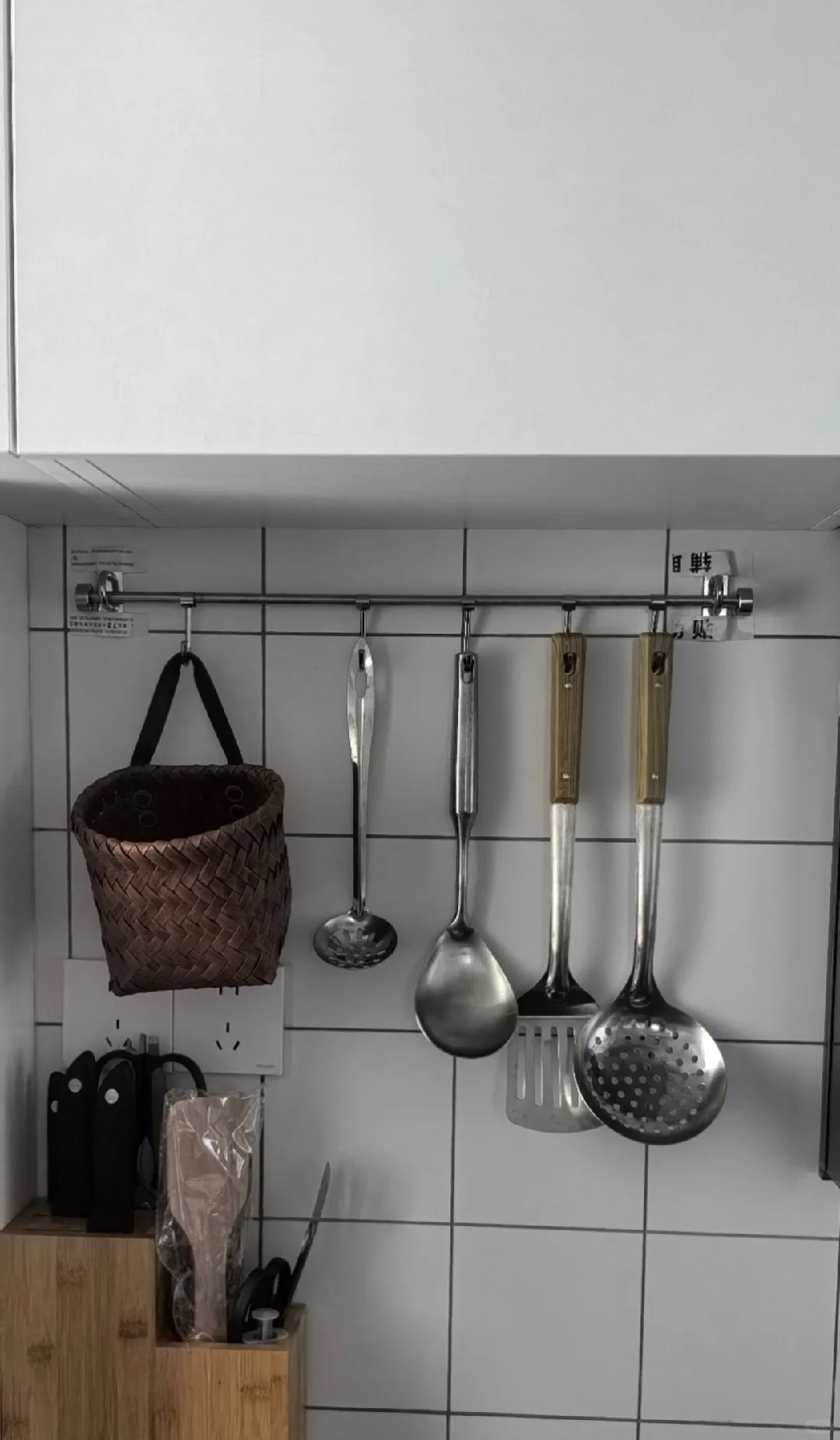 网友@小蝴蝶 的分享:厨房台面上放东西太乱,我在窗户口支了一个挂杆,平时挂锅刷、抹布啥的,还能帮我晾干,大家可以试一试这个设计,挺好用的。