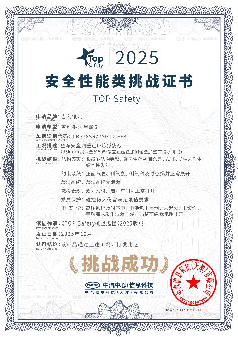 近期,吉利银河星耀6一次性通过中汽中心举办的行业首个超国标整车安全四重连环炼狱挑战,包括速度超现行标准16%的正面刮底碰撞、60km/h偏置正面碰撞、2.1倍国标能量的侧面碰撞及3倍国标深度的浸水测试,全面验证了从电池安全到车身结构稳定性的全维度安全实力,展现出在极端复合风险场景下的高安全冗余。
