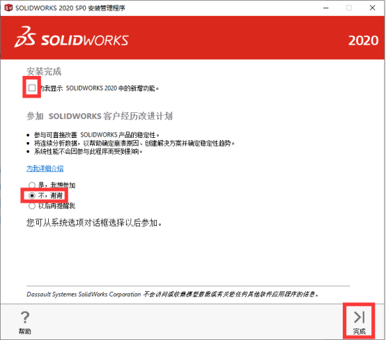 18、显示安装完成,把【为我显示】前面的√取消掉,然后点击底下的【不】,再点击【完成】。