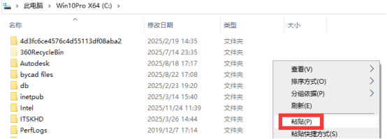 7、打开电脑C盘,在右边空白区域鼠标右键,点击【粘贴】。