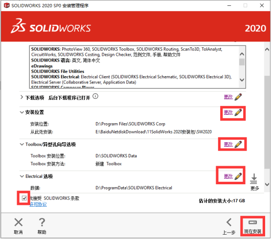 15、点击【安装位置】、【Toolbox/异型孔向导选项】、【Electrical选项】右边的【更改】按钮,将默认的C盘改成别的盘,并且记住这个地址,勾选【我接受】,然后点击【现在安装】。
