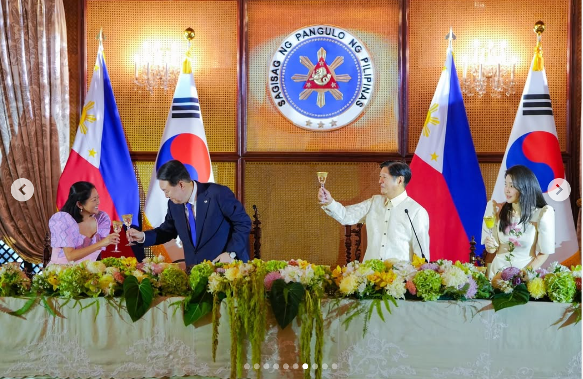 晚宴上,尹锡悦夫妇的座位布置典雅精致,餐桌上摆满鲜花,水晶高脚杯在灯光下闪烁着柔和的光芒。