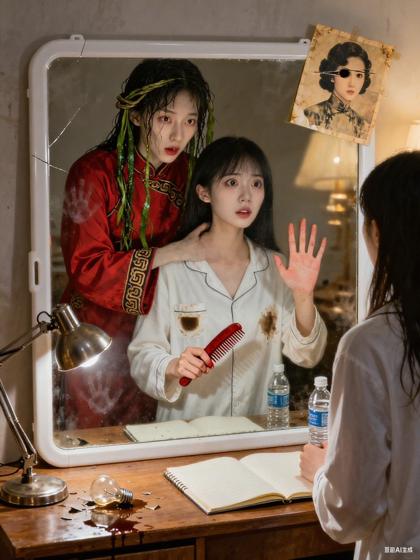 突然,镜中的影像开始扭曲。镜面像是变成了浑浊的河水,一个穿着红旗袍的女人从里面缓缓浮了上来,头发缠着墨绿色的水草,脸泡得肿胀发青,嘴角咧开一个诡异的弧度,露出白森森的牙。“你凭什么拿我的梳子……” 她开口说话,声音里混着水泡破裂的 “咕噜” 声,一只冰冷黏湿的手猛地穿透镜面,掐住了林薇的脖子!