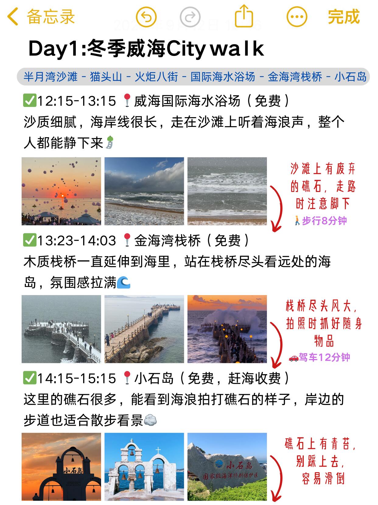😊 再走8分钟到金海湾栈桥,延伸至海中风景佳,风大抓好随身物品。最后去小石岛,看海浪拍礁石很有意境,礁石有青苔千万别踩,小心滑倒。😊 两天威海之行圆满结束,全程慢节奏看海超舒服,海边风大,保暖和防滑一定要做好。