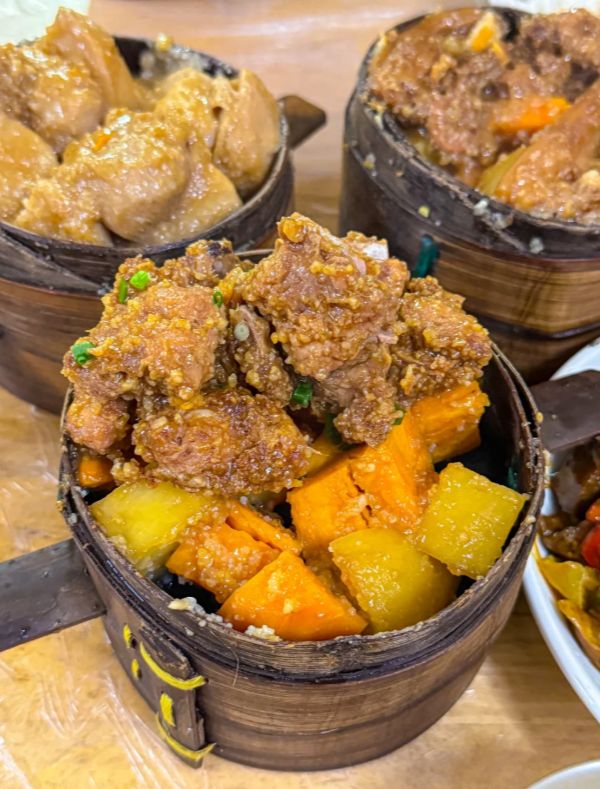 沔阳三蒸以粉蒸技法最具代表性,将五香熟大米粉与肉类、水产、蔬菜结合,通过高温蒸汽使米粉吸饱食材汁水,形成“肉嫩藕糯,润口味美”的口感。例如经典菜肴粉蒸肉,选用猪五花肉切条,拌入腐乳汁、绍酒等调料,裹米粉后与老藕同蒸,肉质肥而不腻,藕块软糯清甜。此外,清蒸保留食材原形原味,如清蒸鳊鱼;泡蒸则以猛火快蒸后浇热油激发香气,如炮蒸鳝鱼,肉质似豆腐般柔软却带韧劲。