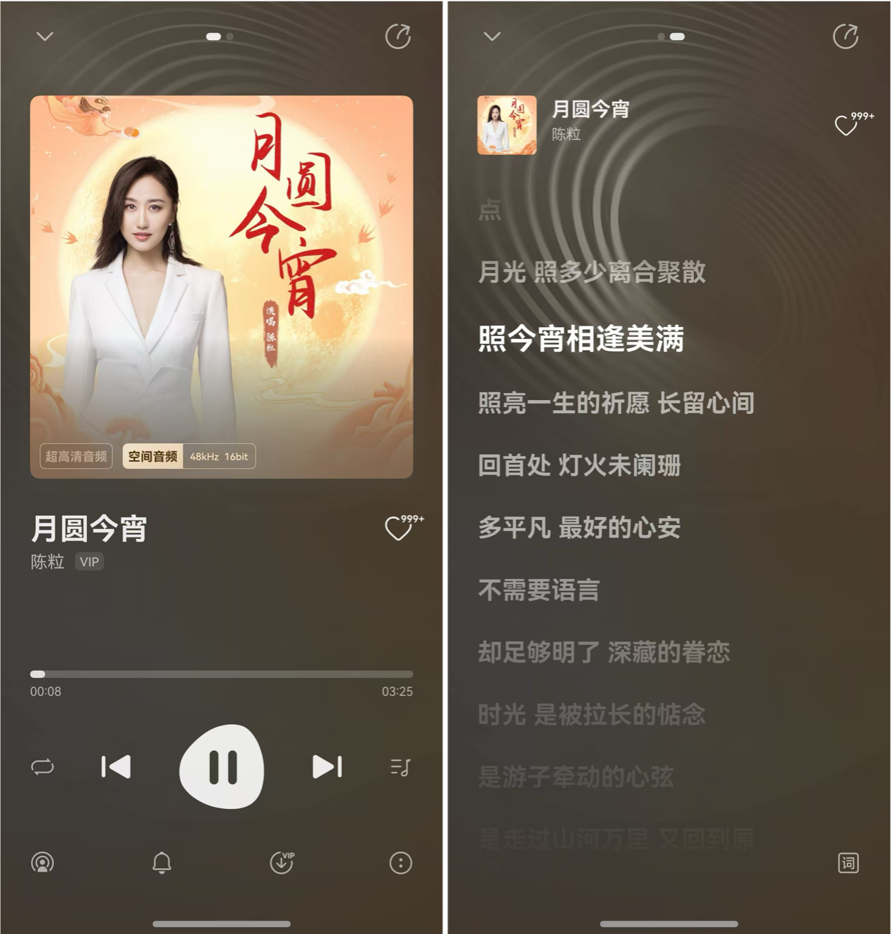 最先点开的是陈粒的《月圆今宵》,戴上耳机开启“空间音频”的一瞬间,那种三维环绕的临场感简直要把我整个人“吸”进去。不同于普通听歌时的左右声道,空间音频让声音仿佛有了坐标,陈粒那略带慵懒和空灵的嗓音像是从正前方三米处慢慢升起。而背景里细微的伴奏声则像是从身体两侧轻轻包裹过来,能清晰地感受到声音的移动轨迹,那种声场效果广阔得不可思议,仿佛自己正站在空旷的月光下,被一阵阵音浪温柔地推搡着,身临其境的感觉真的会让人瞬间泪目。