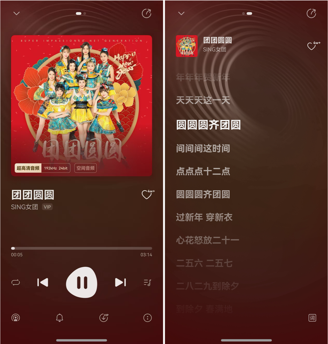 随后我又点开元宵节歌单中SING女团的《团团圆圆》,听着听着脑海里浮现的全是小时候全家人团聚的画面,在那一刻,思念家人的情绪突然到了顶点。这首象征着团圆的歌曲在此时对我来说也不仅是旋律,更是跨越距离的情感寄托,在“超高清音频”加持下表现的十分出彩,真度极高的音效,精准捕捉到了电子乐器和人声交织的每一个细节。那种纯净而生动的听感,就像是在寒冷的冬夜喝到了一口刚好温热的甜汤,饱满且富有情绪价值。