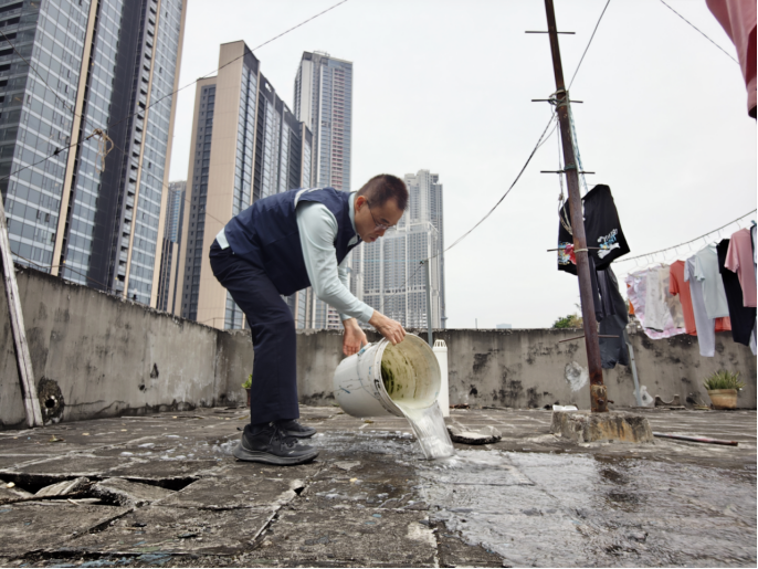 行动中,网格员以“面对面”讲解的形式,向居民普及登革热、基孔肯雅热的传播途径与预防要点,并逐户发放防控宣传册,确保防疫知识深入人心。同时,针对蚊虫易滋生的积水环境,网格员主动协助居民检查家中水生植物、花盆托盘、闲置容器等关键区域,现场指导“翻盆倒罐”清理积水,从源头清除蚊虫孳生地,切实将防控措施落实到居民日常生活的每一个细节中。