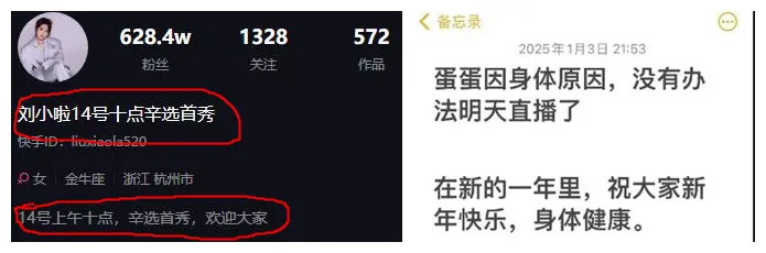 随后有消息传出,其13号的直播场次更改为蛋蛋直播,而刘小啦的首带推迟一天,改为14号。但这一消息只是出于水友的切片,并没有得到辛选方面的证实。就在刚才,刘小啦的账号已经官宣了14号首秀的消息,并在主页中发布了直播预约,但是蛋蛋账号的最后内容仍旧停留在1月3日。