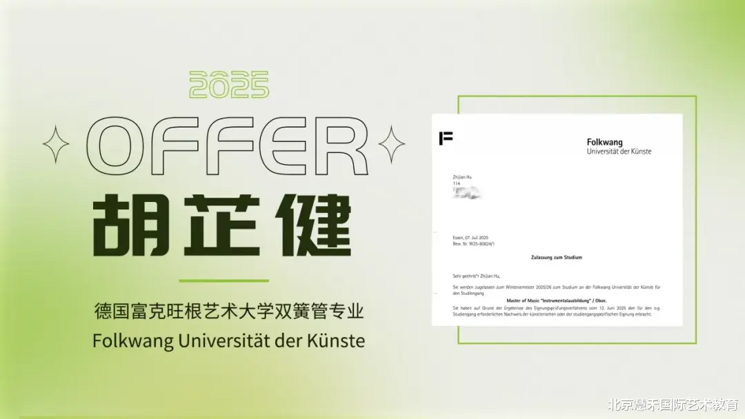 2025 年,胡芷健终于如愿来到德国,带着积累多年的学习与舞台经验,参加多所音乐学院的考试。经过数月的准备与努力,他于同年七月被德国 Folkwang Universität der Künste 双簧管专业录取,正式开启在欧洲的艺术学习旅程。