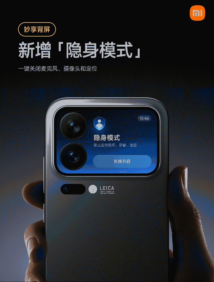 在隐私泄露频发的数字时代,小米再次为用户的安全保驾护航。小米17 Pro系列妙享背屏全新推出「隐身模式」功能卡片,让你随时随地一键进入隐私保护状态。