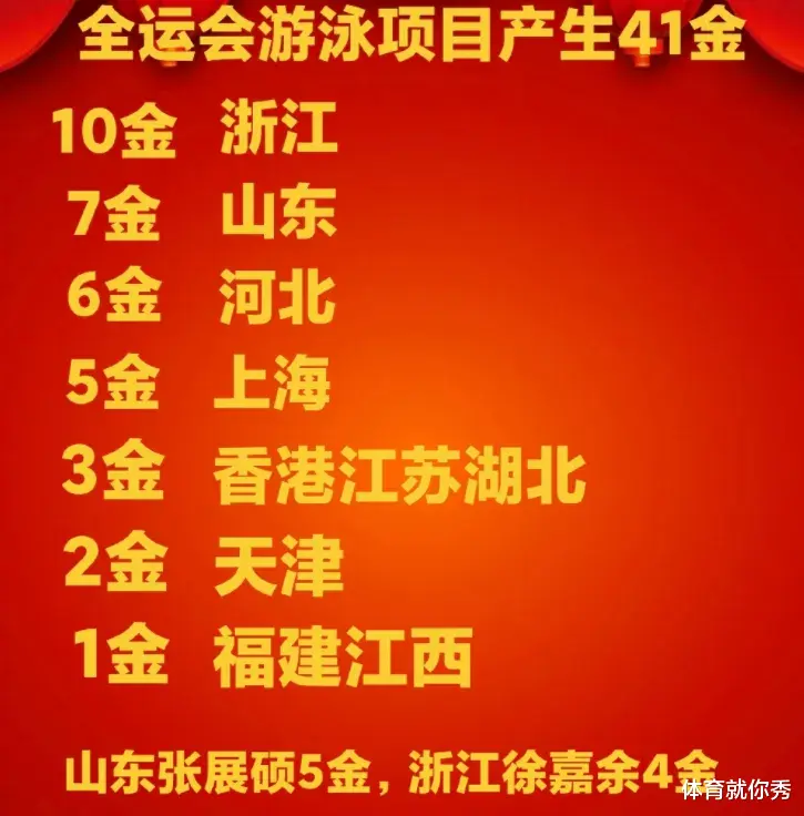 其中徐嘉余在男子50米仰泳的比赛中夺冠,收获了本人在本届亚运会的第4枚金牌,而男子400米个人混合泳的比赛中,老将汪顺再获一枚金牌,他个人在全运会的历史上,已经拿到了19枚金牌!山东队的小将张展硕则是获得了男子1500米自由泳的冠军,虽然是男子400米混合泳的预赛第一,但因为与1500米自由泳的比赛太近,导致张展硕也是只能放弃400米混的比赛了,要不然他和汪顺还真有一拼。游泳比赛全部结束,浙江队拿到了其中的10枚金牌,排名所有省队的第一位,山东队获得了7金,河北也有6金入账。而昨天在田径项目中,也产生了5枚金牌,其中备受观众期待的男子和女子100米的决赛,也是高手云集。其中男子项目的参赛运动员,都是00后的运动员,最终湖北的李泽洋后来居上,以10秒11的成绩,获得了冠军!女子100米的决赛,葛曼棋和梁晓静因为伤病的原因,都没能进入到决赛,不到17岁的小将陈妤颉,最终以11秒10的成绩,获得了最后的冠军,这也是她的第一个全运会的女子100米金牌。福建的龚德滨和广东队的莫家蝶,分别获得了男子和女子的100米栏的冠军,女子标枪的冠军,则是归属了湖北选手苏玲丹!
