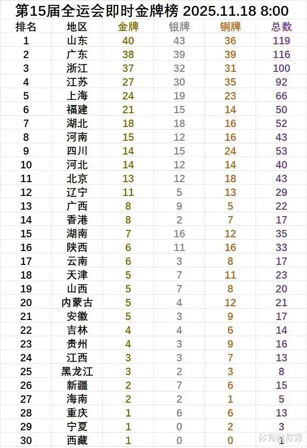 皮划艇静水的比赛,山东队和浙江队的比拼还在继续,昨天的4枚金牌中,双方各拿到了其中的2枚金牌。而在体操项目中,昨天一共产生了5枚金牌,广东、湖南、湖北、四川和浙江的选手,分享了这5枚金牌。在举重方面,浙江队的优势也非常明显,陈戬和石智勇分别获得了男子67公斤级和73公斤级的冠军。截止到昨天,在最新的金牌榜上,浙江队的金牌数量已经达到了37枚,紧追排名第2的东道主广东队,双方的差距只有一枚金牌。而排名第一的,毫无疑问还是山东队,山东队的整体实力也是最强的,过去4届的全运会,金牌榜都是排名第一的位置。当然,这个排名是只统计了本届全运会的金牌,并不包含奥运会金牌在全运会上的折算,所以山东、广东和浙江队,不出意外的话,也会在本届全运会的比赛中,占据前3的位置。而前10名的竞争也非常激烈,湖北昨天表现不错,已经反超河南,以18金升至第7的位置,河南队领先四川和河北,也只有1枚金牌的优势。
