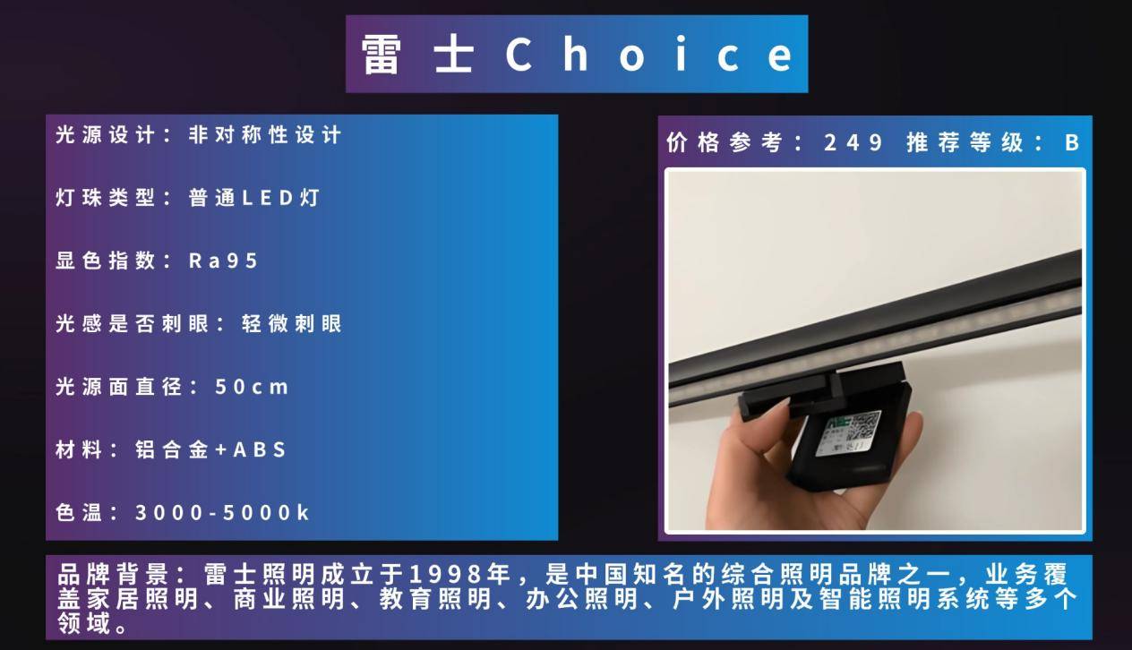 光线亮度不足:雷士Choice的照度范围较低,若用于较大桌面易造成边缘昏暗,比较适合小桌子使用。