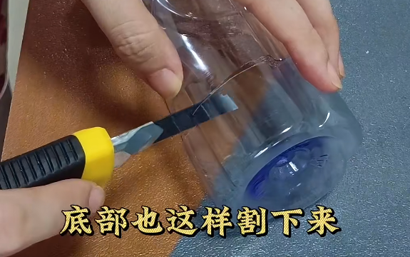 只要我们用美工刀将瓶子1/3处切割下来,当然这个大小是可以自己控制的,你可以按照自己的需要来切割。然后再将矿泉水的底部也按照这个大小切割下来一段。