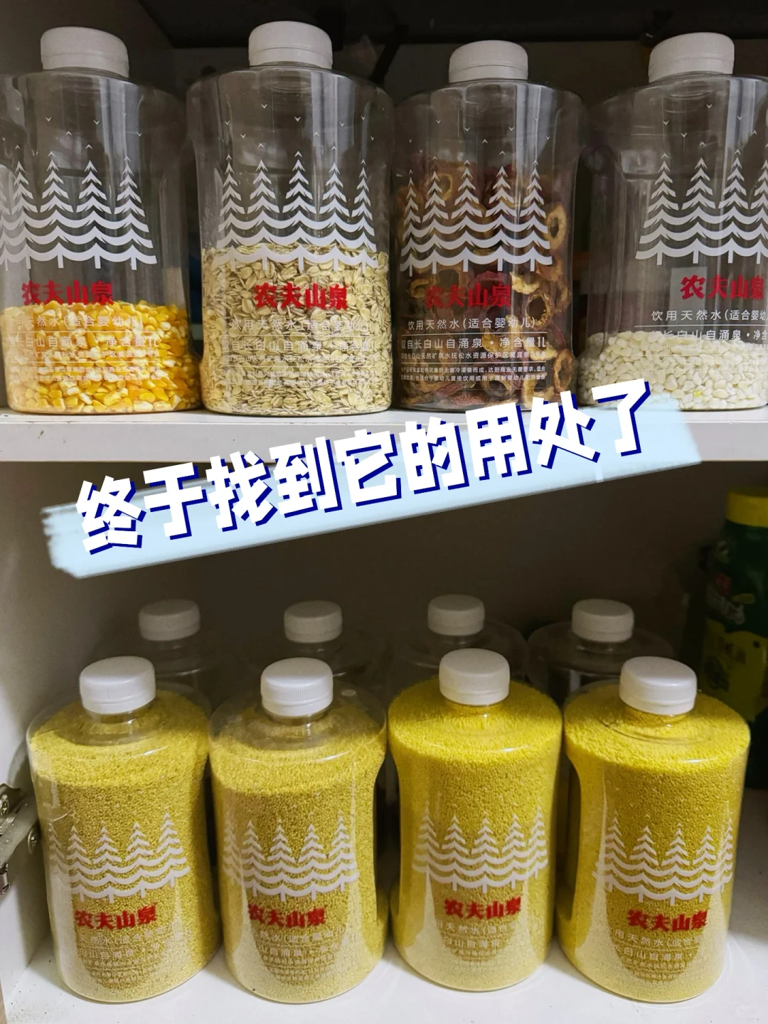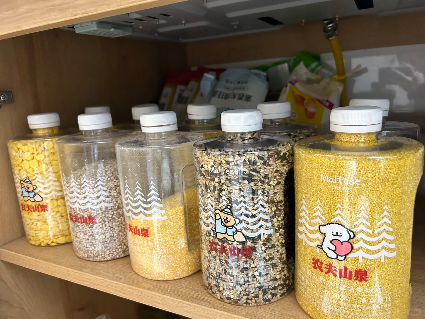比如家里的一些杂粮,放在规格一样大小的矿泉水瓶中,非常整齐,毫无违和感,