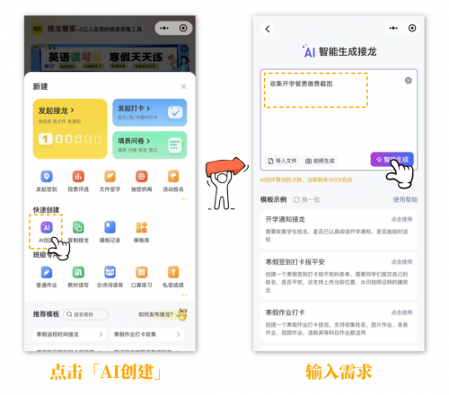 点击「AI创建」,直接输入你的需求,如“收集开学餐费缴费截图”,AI会自动识别并生成适配的接龙表单;