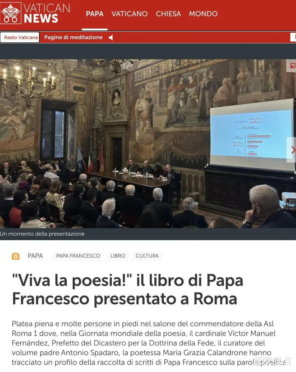 世界诗歌日当晚,罗马圣神医院(ospedale Santo Spirito)的指挥官大厅举行了教宗方济各的诗学文集《诗歌万岁!》(Viva la poesia!)发布会。