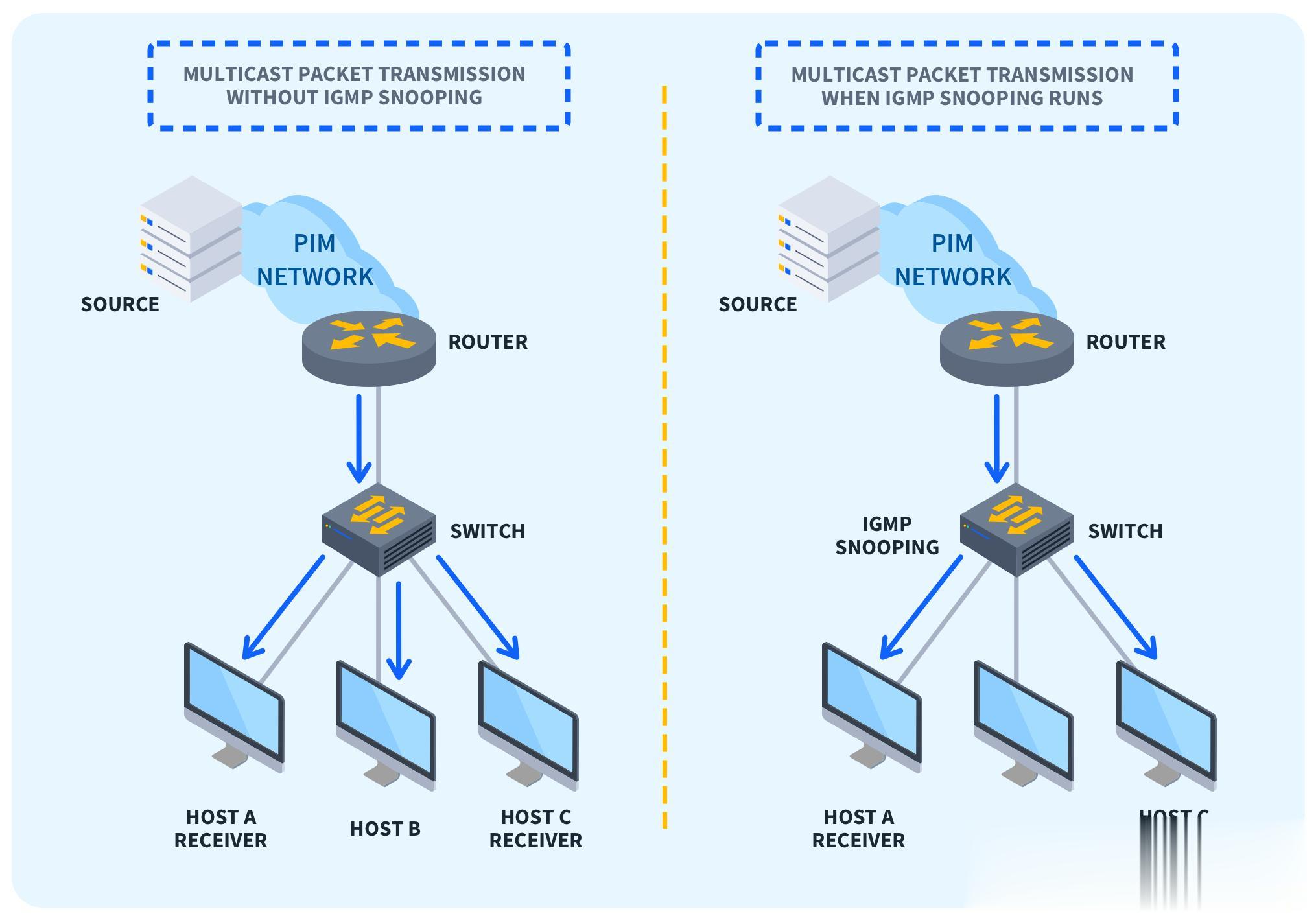 交换机不参与 IGMP,但会“偷听” IGMP 报文,从而知道哪些端口加入了组播组。