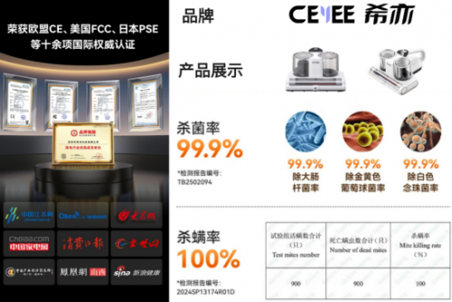 在除螨方面,希亦RM1除螨仪没有过多的花哨功能堆叠,而是把六大核心除螨技术打磨成熟:通过高频拍打、15000Pa强吸力、UV-C深紫外杀菌、65°C热风渗透、七重高密过滤、AI智能感应等除螨方式,每一步都围绕“深层清洁+持久耐用”设计。实测除螨率100%,三大病菌杀灭率99.99%,过滤效率同样99.99%,并还通过了欧盟CE、美国FDA等十多项国际认证加持,品质可靠。