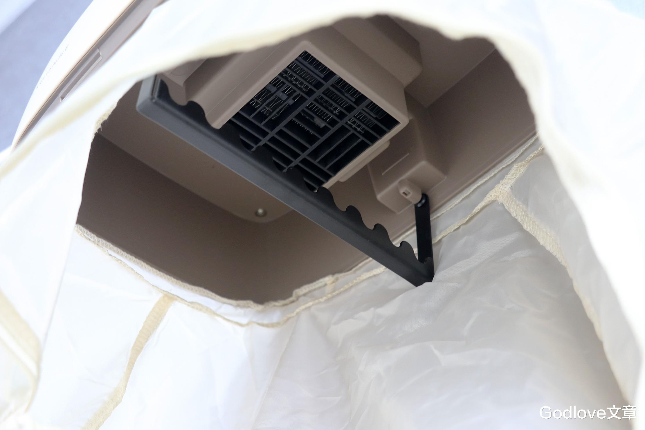 宫菱便携式烘干机下翻盖打开后可看到黑色电源线和布罩收纳于此: