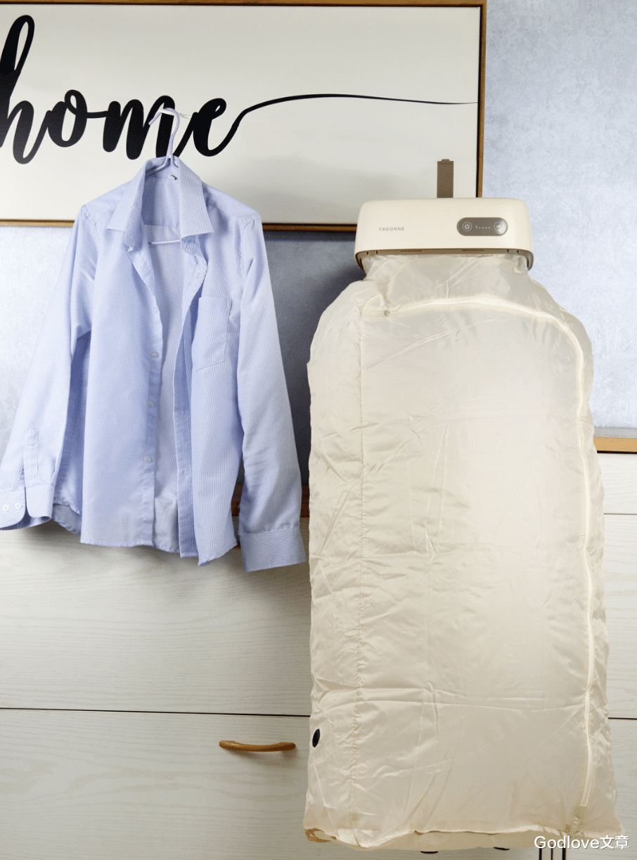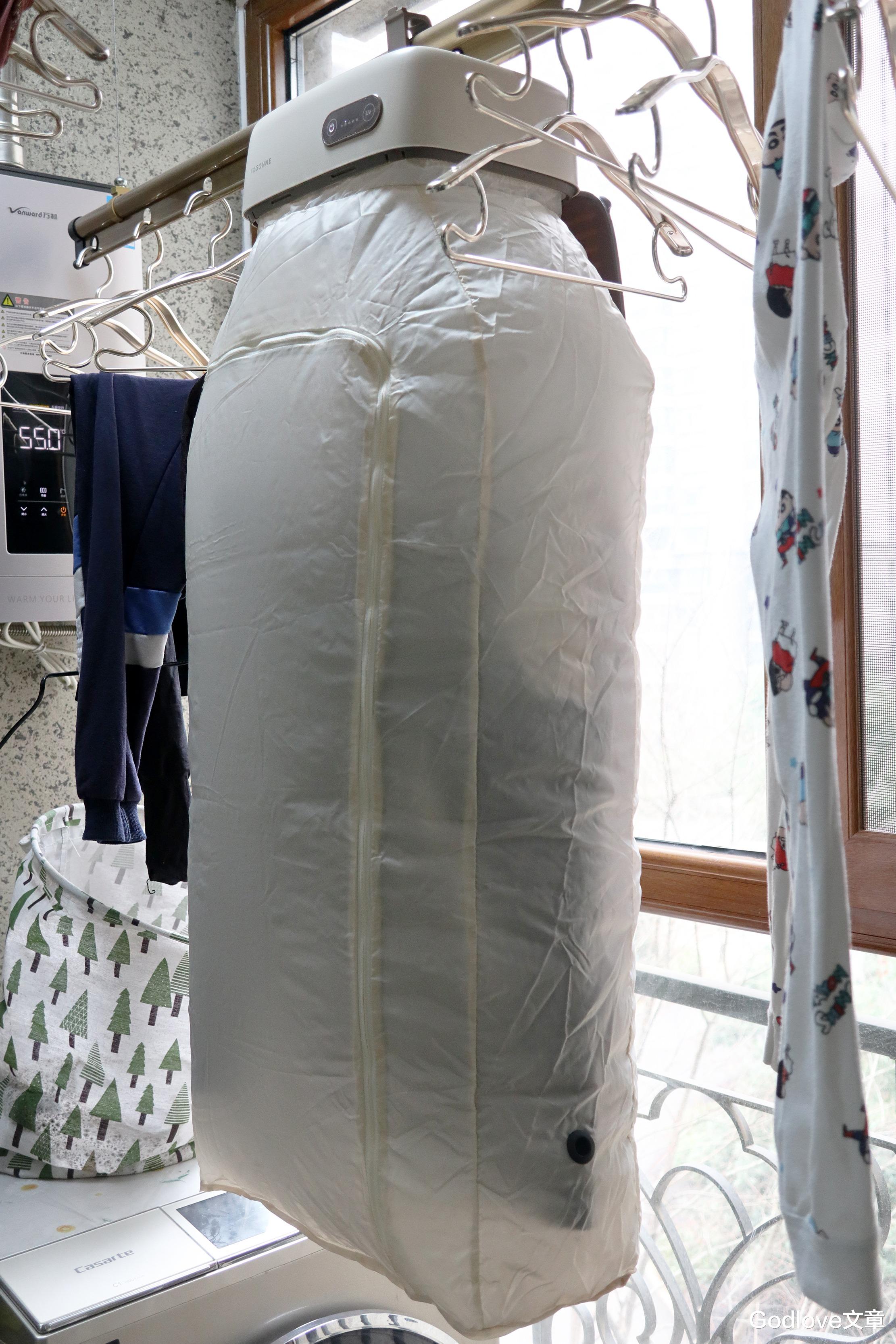 将衣服挂在挂衣杆,拉好拉链并挂好挂钩接上电源,宫菱便携式烘干机即可使用。