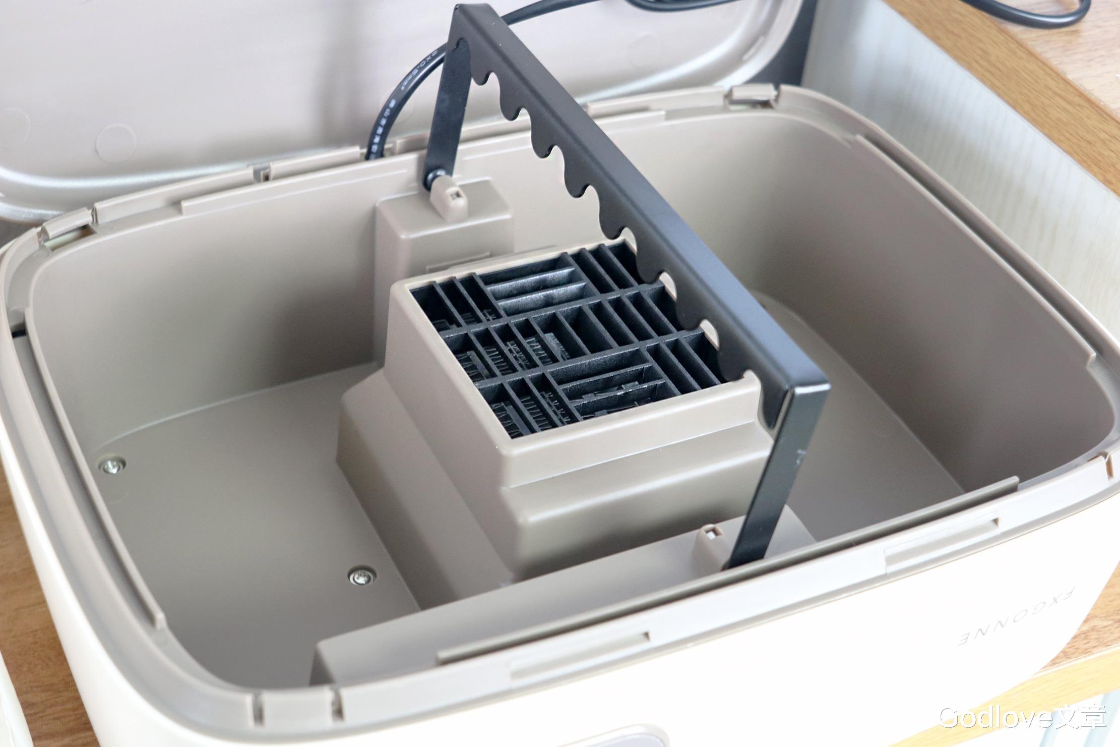 宫菱便携式烘干机采用了一体成型设计,没有多余的螺丝孔和缝隙,四个角落均设有加厚防滑垫,能够有效增加摩擦力,同时也是下翻盖的设计。