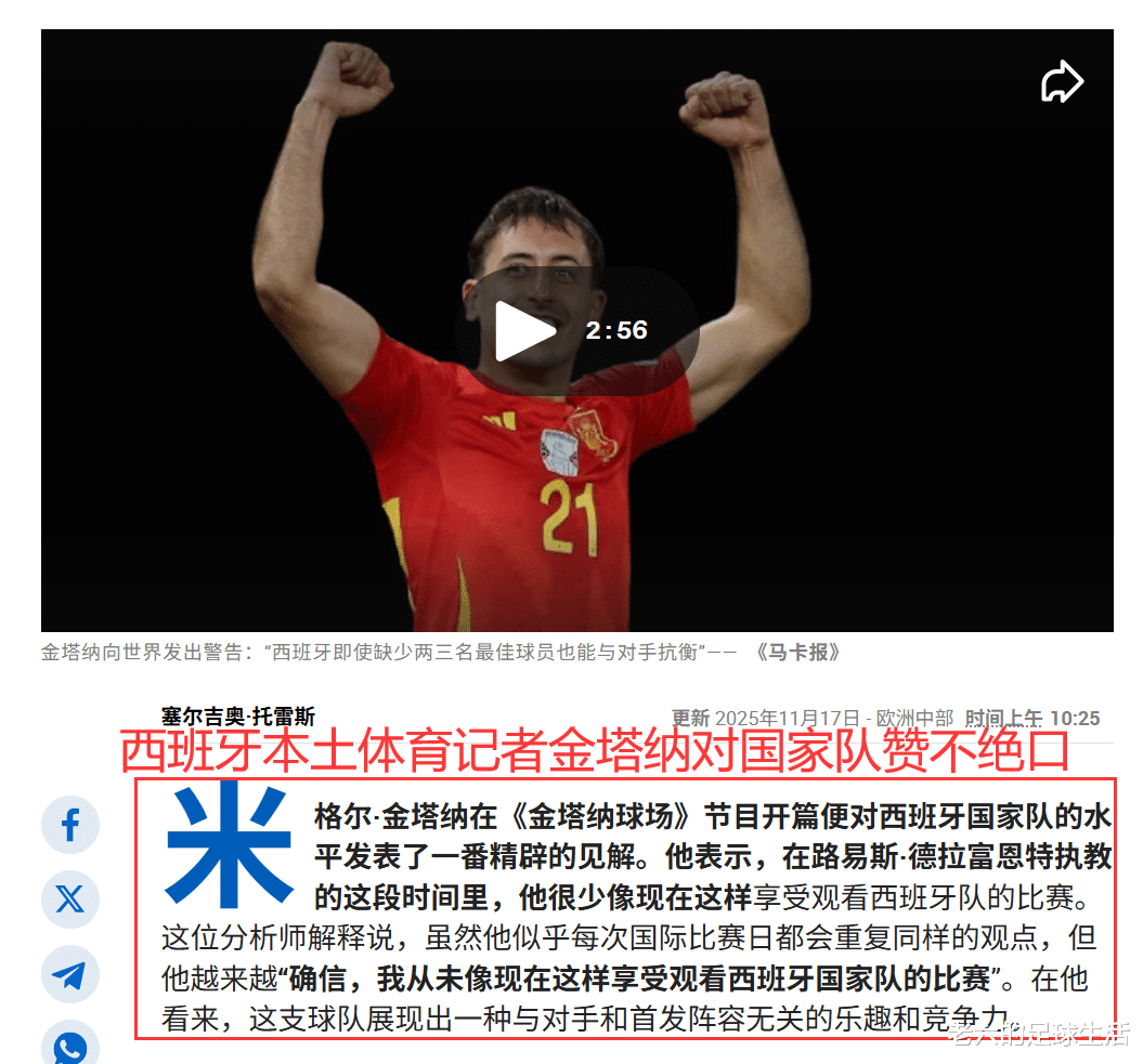 西班牙的著名足球记者米格尔·金塔纳在自己的社媒里讲道他很少像现在这样享受观看西班牙国家队的比赛,他们展现出了一种与对手和首发阵容都无关的竞争力。