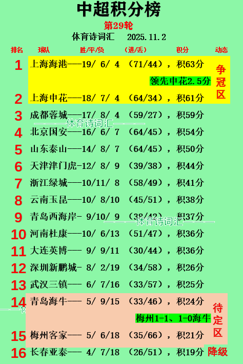中超第29轮没有同时开赛,使得争冠、保级都出现了变数,本轮成都蓉城不敌河南直接退出冠军行列,上海双雄末轮继续纠缠;梅州客家、长春亚泰的不胜,则让武汉三镇、深圳新鹏城提前上岸。
