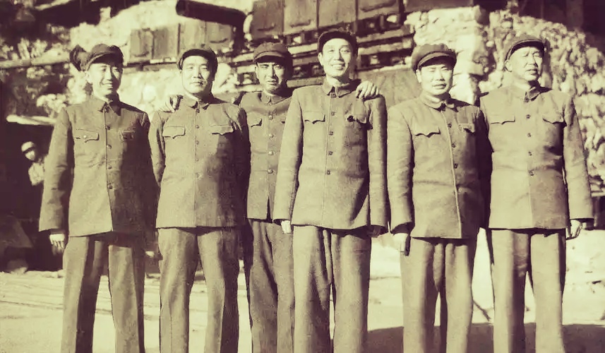 杨得志(左五)、杨勇(左三)、李达(左二)、李志民(左四)、王平(左六)、解方(左一)在朝鲜