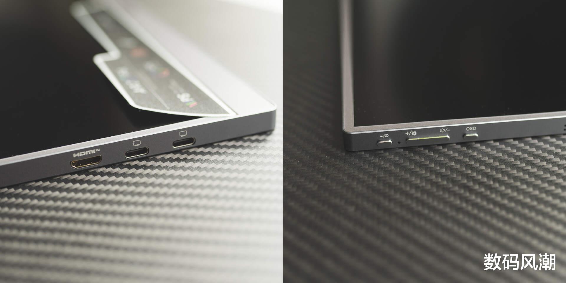 Z3FC机身左侧集中了所有接口与按键,布局清晰易操作:从上到下依次为返回/电源键、音量/亮度/音量调节键(兼菜单切换)、OSD开关。键帽比较突出,按键反馈清晰,盲操作也能快速找到对应功能。下方接口区:配备1个迷你HDMI口和2个全功能Type-C 3.1口,三个输入通道足以满足不同设备连接需求。中间对称内置了扬声器开孔,音质肯定是不及iPad Pro的四扬声器,但总体中规中矩的表现,应付日常看看视频或听语音,至少解决了便利性的问题。