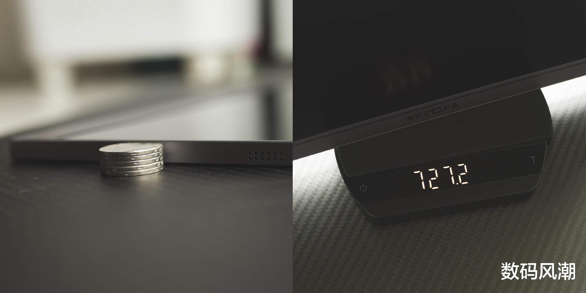 机身整体实测重量727克,厚度差不多5枚一元硬币,单手可以轻松握持或背包携带(记得做好屏幕保护)。可以这么说,除了“没法减重”的16.1英寸屏幕,Z3FC已经做到我对于便携显示屏的核心需求。